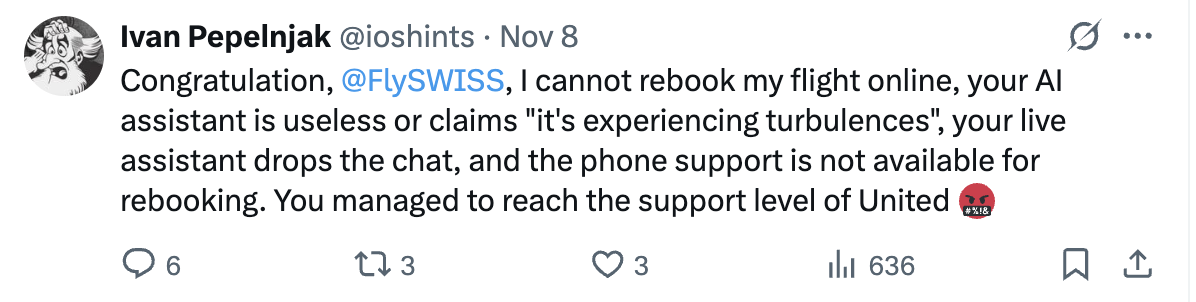 Unfortunately (for me), someone within Swiss Airlines bought the “reduce support costs with AI” fairy tale. The only way to rebook a flight (according to their website) is through an online chat, and that online chat is AI-powered… and that’s where the nightmare started.