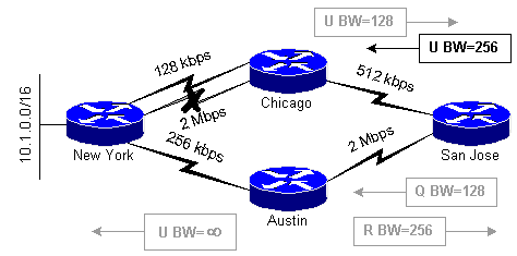 The update packet sent from San Jose to Chicago carries information about a better route for network 10.1.0.0/16 than the one Chicago is currently using (128 kbps link to New York). Chicago selects new successor and informs all other neighbors (New York router) that it has a better route. It also sends a poison update packet to its new successor - San Jose router, sending all together two update packets after receiving an update from San Jose.